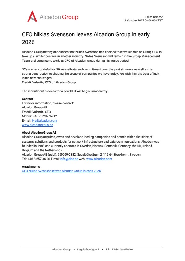Alcadon Group hereby announces that Niklas Svensson has decided to leave his role as Group CFO to take up a similar position in another industry. Niklas Svensson will remain in the Group Management Team and continue to work as CFO of Alcadon Group during his notice period.