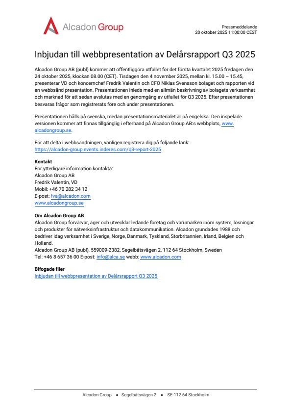 Alcadon Group AB (publ) kommer att offentliggöra utfallet för det första kvartalet 2025 fredagen den 24 oktober 2025, klockan 08.00 (CET). Tisdagen den 4 november 2025, mellan kl. 15.00 – 15.45, presenterar VD och koncernchef Fredrik Valentin och CFO Niklas Svensson bolaget och rapporten vid en webbsänd presentation. Presentationen inleds med en allmän beskrivning av bolagets verksamhet och marknad för att sedan avslutas med en genomgång av utfallet för Q3 2025. Efter presentationen besvaras frågor som registrerats före och under presentationen.