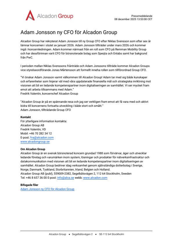Alcadon Group har rekryterat Adam Jonsson till ny Group CFO efter Niklas Svensson som efter sex år lämnar koncernen i slutet av januari 2026. Adam Jonsson tillträder under mars 2026 och kommer ingå i koncernledningen. Adam kommer närmast från en roll som CFO på Remman Mobility Group och har dessförinnan varit CFO för börsnoterade bolag som Speqta och Enlabs samt har bakgrund från PwC.