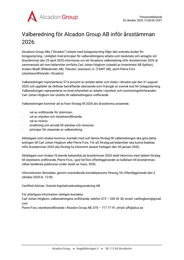 Alcadons Group ABs (”Alcadon”) arbete med bolagsstyrning följer den svenska koden för bolagsstyrning. I enlighet med principer för valberedningens arbete som beslutats och antagits vid årsstämman den 29 april 2025 informeras om att Alcadons valberedning inför årsstämman 2026 är sammansatt att som ledamöter omfatta Carl Johan Högbom (utsedd av Investment AB Spiltan), Anders Bladh (Ribbskottet AB), Theodor Jeansson Jr. (TAMT AB), samt Pierre Fors (styrelseordförande i Alcadon).